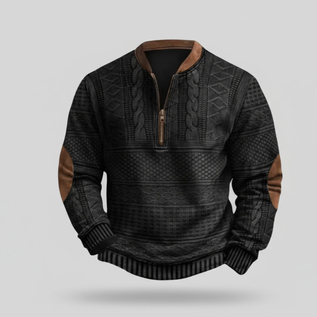 This men’s sweater features a short zip closure and a textured surface with geometric and braided elements. Designed as a pullover, it includes long sleeves with contrast elbow patches and ribbed cuffs, giving the garment a structured and balanced appearance. A contrasting detail at the neckline completes the design for cooler conditions.